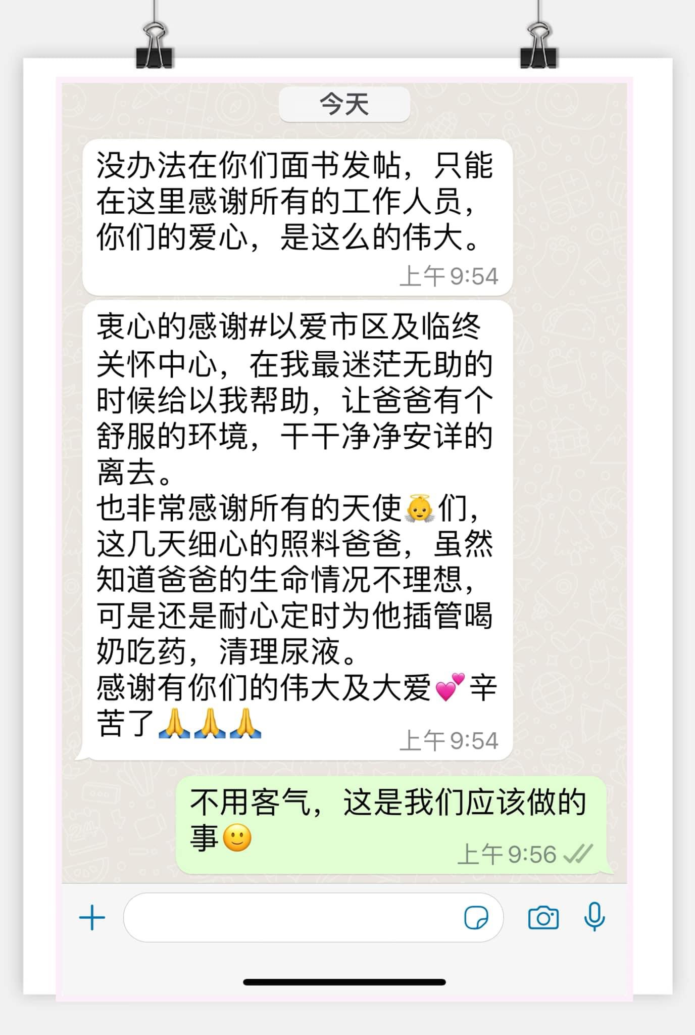 收到家属的信息,鼓励和认同是我们走下去的动力,虽然开设安宁中心是个使命,但在执行过程中是需要很多的支持和鼓励,尤其是临终关怀这艰难的慈善工作。。。。。