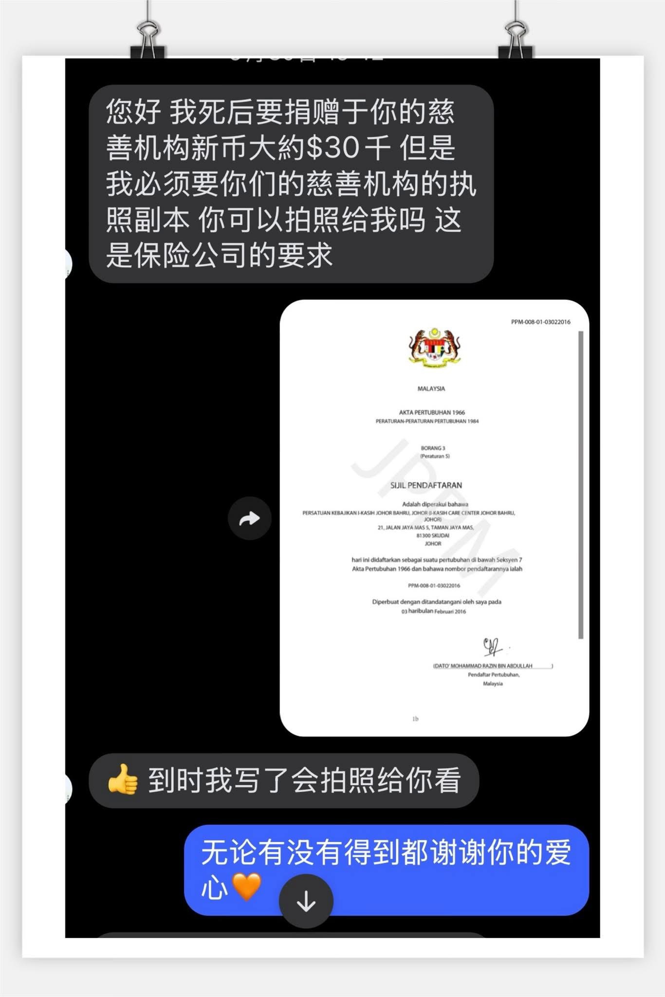 很习惯性地时不时会检查信息,以免有朋友的询问信息忘了给于回复,在翻阅间就无意中看到这两个月前的信息,我不认识这位朋友,从字里行间猜她是新加坡人,也是一名癌症患者,因为之前她有询问过我以爱有接受新加坡人吗?碍于规条我婉拒了她,她说很欣赏以爱的临终关怀服务,她还说会立遗嘱在她离开后把一笔三万新币捐赠以爱,对于以爱来说这当然是欢迎至极的事。。。