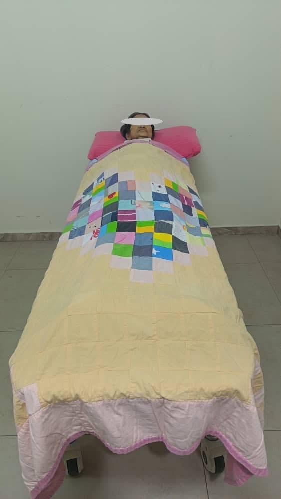 她的身世可怜,在社会上没有什么地位也吃了不少苦,感恩她可以来到以爱这里成为我们的贵宾住客,在这两个多月里以爱护理人员把她当作贵宾般地服侍,直到她离开也为她盖上美美的“爱心白衲被”,让她有尊严的活着也带着尊严的离开,这是以爱可以为她做的事。。。。。