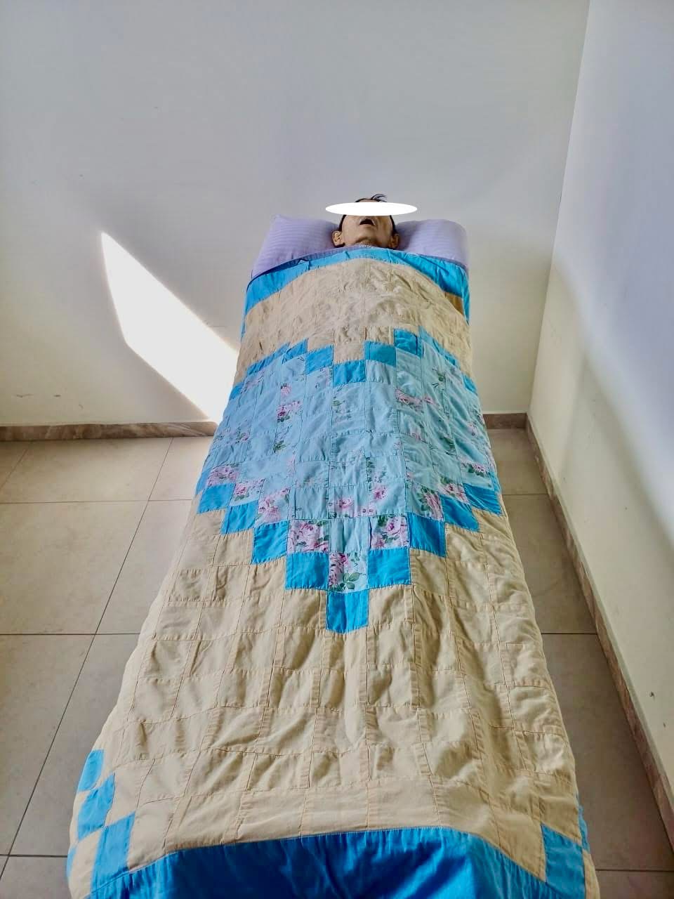 盖上美美爱心百衲被的阿才哥静静地躺在以爱安息室内等待亲友处理后事…………