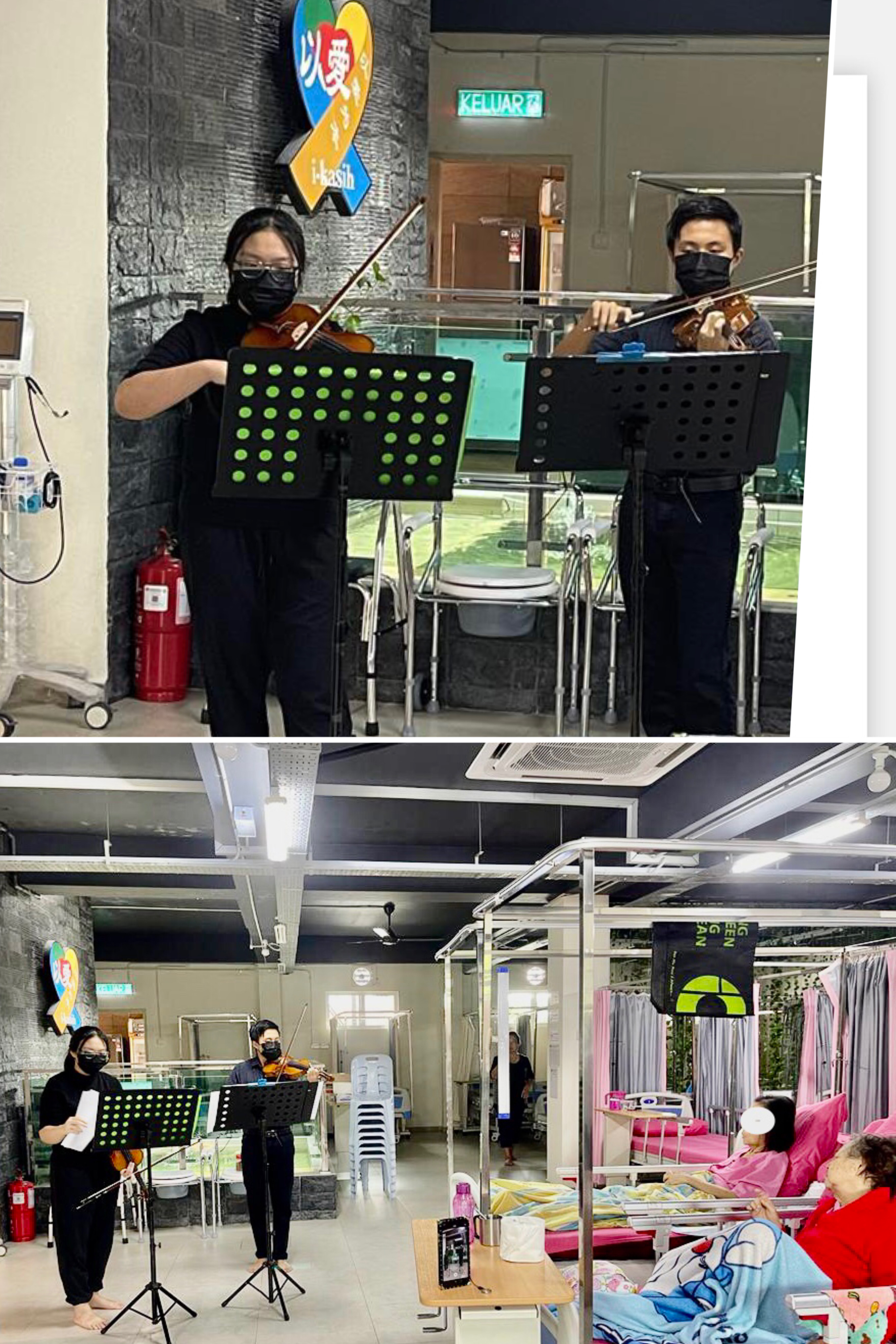 以爱安宁护理中心是专门接待末期癌友入住的中心,但接待癌友入住并不代表让他们在里面等“时间”,安宁护理中心是在代替家人照顾癌友之余也希望癌友们可以有康复回家的机会,这不是不可能的事,其中的元素包括了环境及心境,音乐治疗就是其中之一,在许多的先进国家常常通过音乐让病患陶冶性情从而增强免疫力,我在设立安宁中心之前也有如此的想法,如今随着安宁中心的运作渐入轨道,也是时候把音乐治疗这元素引进来了,很感恩小提琴学院Bryan’s Class/ JB private violin teacher愿意配合並派出了两位优秀小提琴手前来安宁中心演奏了几首好曲,听员工说其中一位癌友边听边打拍子,另一位癌友还会拍手回应,更难得的是,有一位不能转动身躯的癌友在听到音乐后还吃力地摆动头部寻找音乐来源呢!这也可以说是让她躺卧许久的身体有律动的机会,好现象。