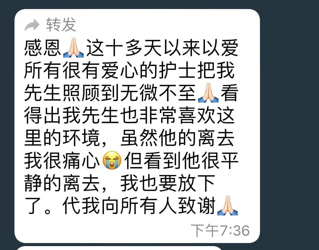 马来西亚慈善机构 | 马来西亚慈善捐款 | 马来西亚临终关怀中心 杂锦Rojak区 来自梁太的鼓励和感激 杂锦Rojak区 2023年7月14日 点击数:375 Share: Facebook Twitter Google+ 梁太发了这个信息给安宁中心的经理,经理转发给我看。。。 老梁于昨天在安宁中心去世,感谢梁太在处理丧事当儿也不忘发信息鼓励和感激我们。 以爱安宁中心的成立就是要让病患安歇家属安心,我们会继续警醒努力以确保做得更好👍,希望梁太早日放下伤痛好好生活以慰老梁之灵…… 上一页 下一页