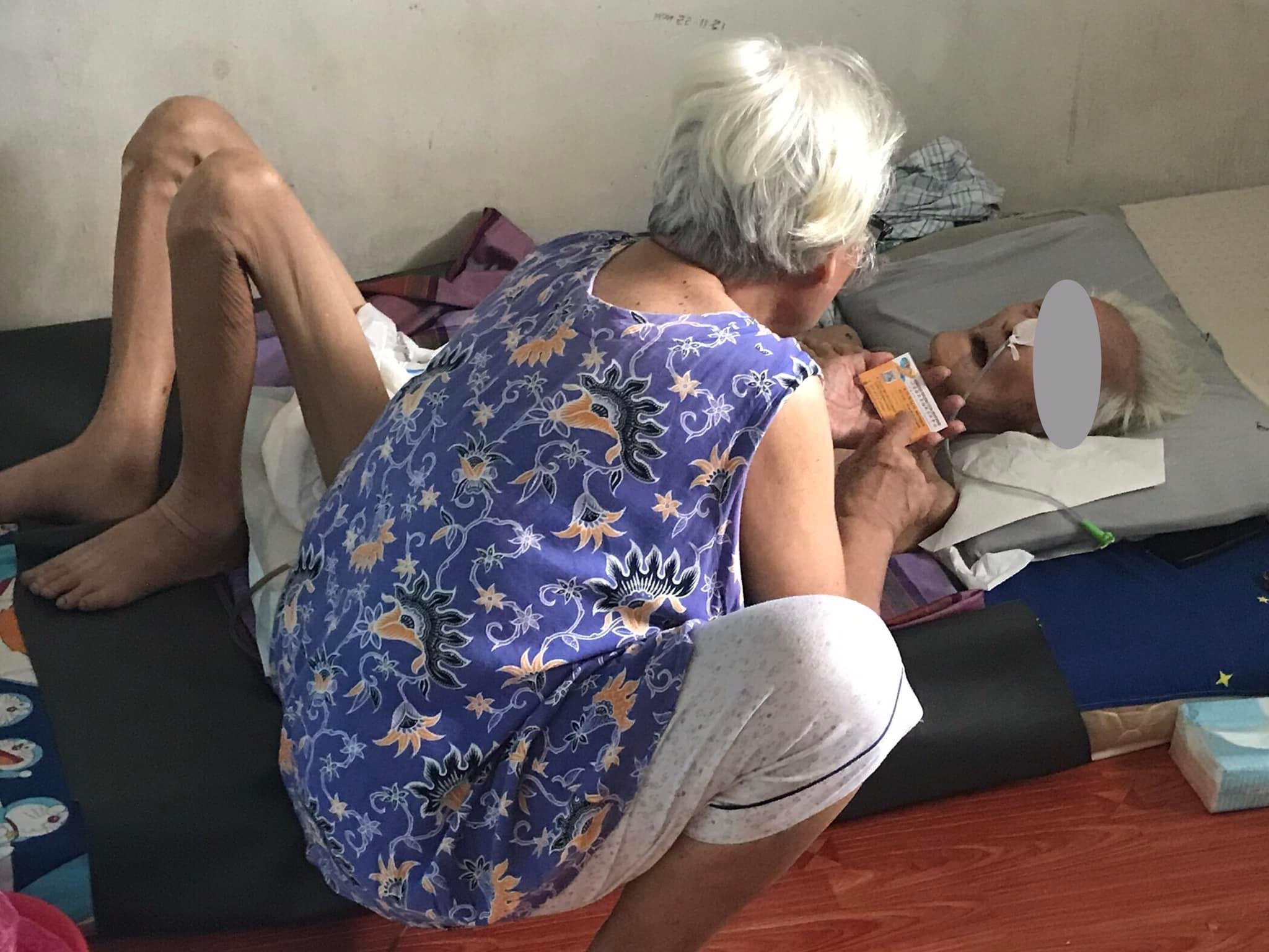 接近80岁的Uncle We 是经由另一家中心转接给我,原本We太太只是要申请尿片,但当看到居住的环境及老We躺在地上的情景我真的不能接受,于是就告诉We太太可以安排老先生住进以爱安宁中心,起初她是不愿意的,因为她说老伴时日不多了,所以不想离开他,我告诉她就算是住进安宁中心她也可以24小时陪伴他一起,而且有那么好的环境及24小时有人分担照顾,还有大厨煮给他们吃,为何不呢?