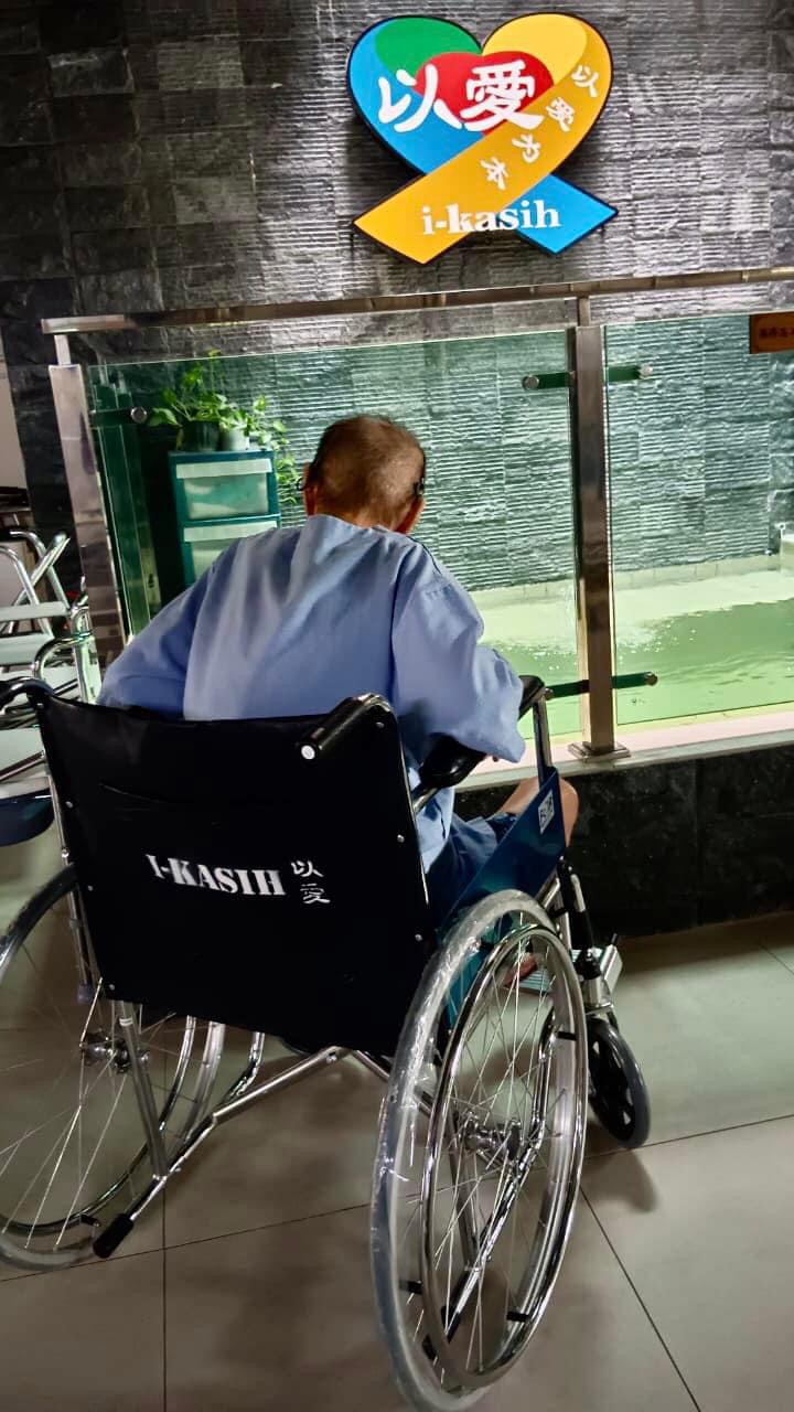 除了韦女士,老梁也是其中一位每天都会坐在轮椅上在安宁中心内移动的癌友,他正在露天鱼池边欣赏鱼儿的同时也享受天空飘下的雨滴,这露天鱼池就是要让住在病房内的癌友们可以感受天气的变化,主要也是让病友们不会与世隔绝。他随身挂着尿袋,由于身体内部被癌细胞侵蚀,所以他的尿液会掺杂着血液,这也导致整个尿袋红红,不明就里的人是会被吓到。。。。