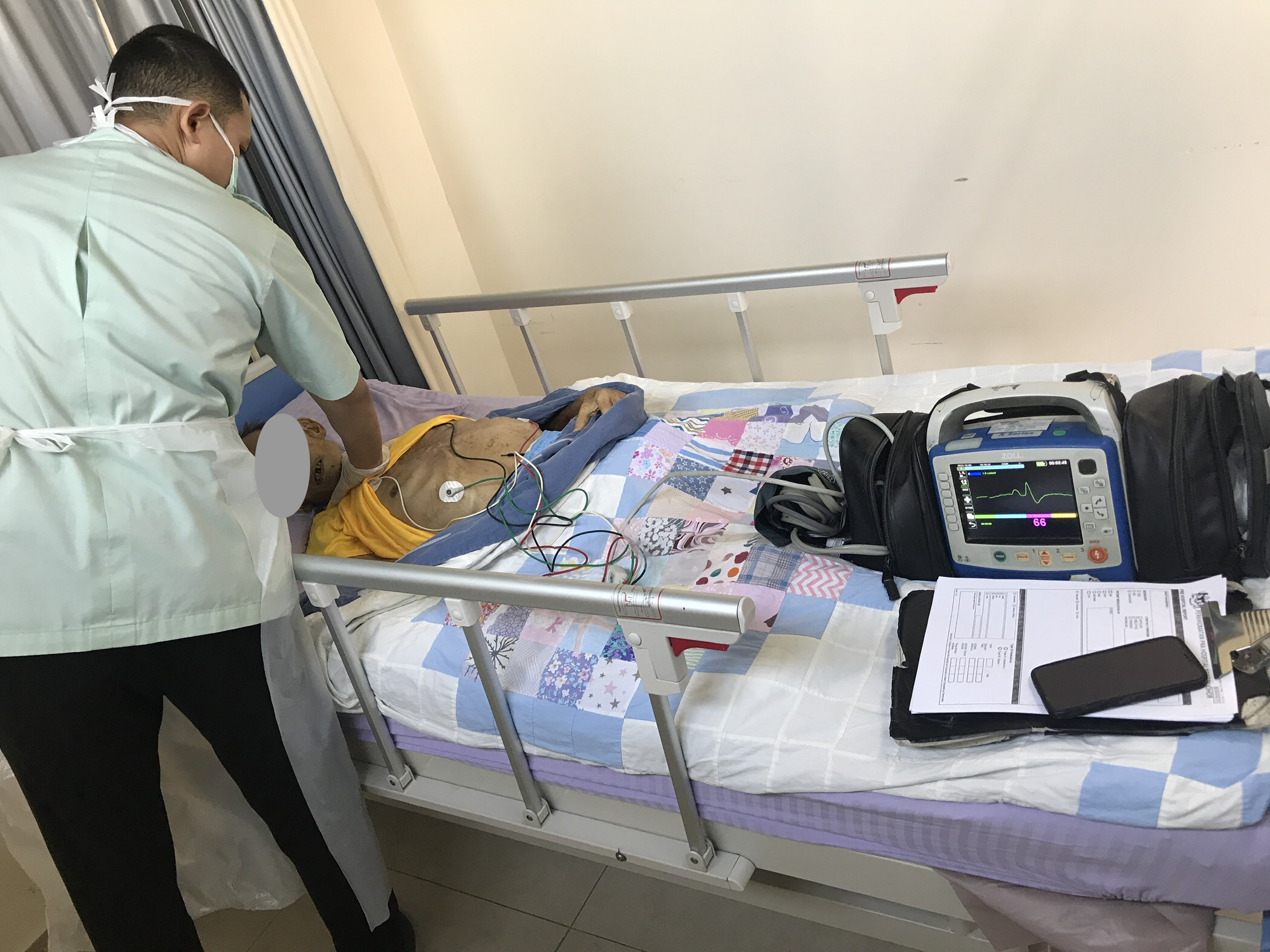 政府医院的救护人员在用先进的仪器给老陈做最后的检测,检测过后就会签字证明死亡,过后家属就可以拿着死亡证明去警局备案,最后才轮到殡葬公司接手,这是必须程序。。。。。